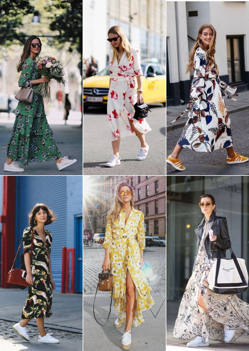 La década de los 80 está de vuelta y recuperamos los estampados más atrevidos. Vestidos largos de estampado floral, colores atrevidos.Vestido largo, fluido y estampado con tus zapatillas favoritas. Mientras más grandes, mejor.