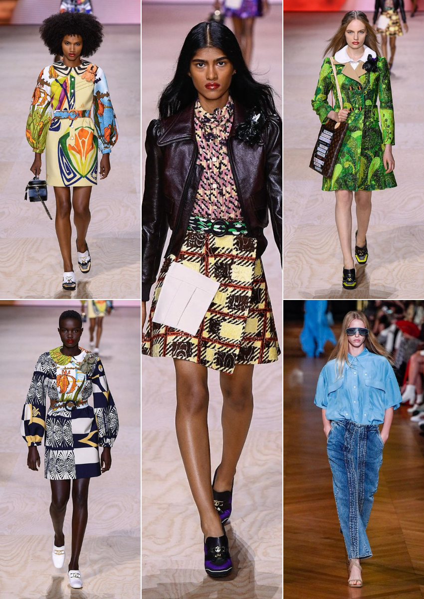 Los jeans acampanados y el total denim, tops skinny, cuellos XXL y estampados vintage.Visto en: Celine, Altuzarra, Victoria Beckham, Marc Jacobs…