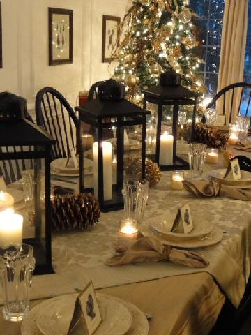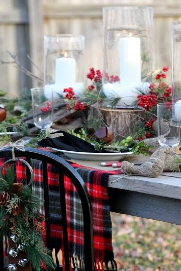 Tonos marrones, amarillo y beige en accesorios muy navideños, el blanco níveo, el clásico rojo, cuadros escoceses, bordó y dorado y cristalería. Pequeños detalles como piñas y ramas pequeñas, un arreglo en verde, copas altas, muérdago, el servicio en perfectas condiciones.
