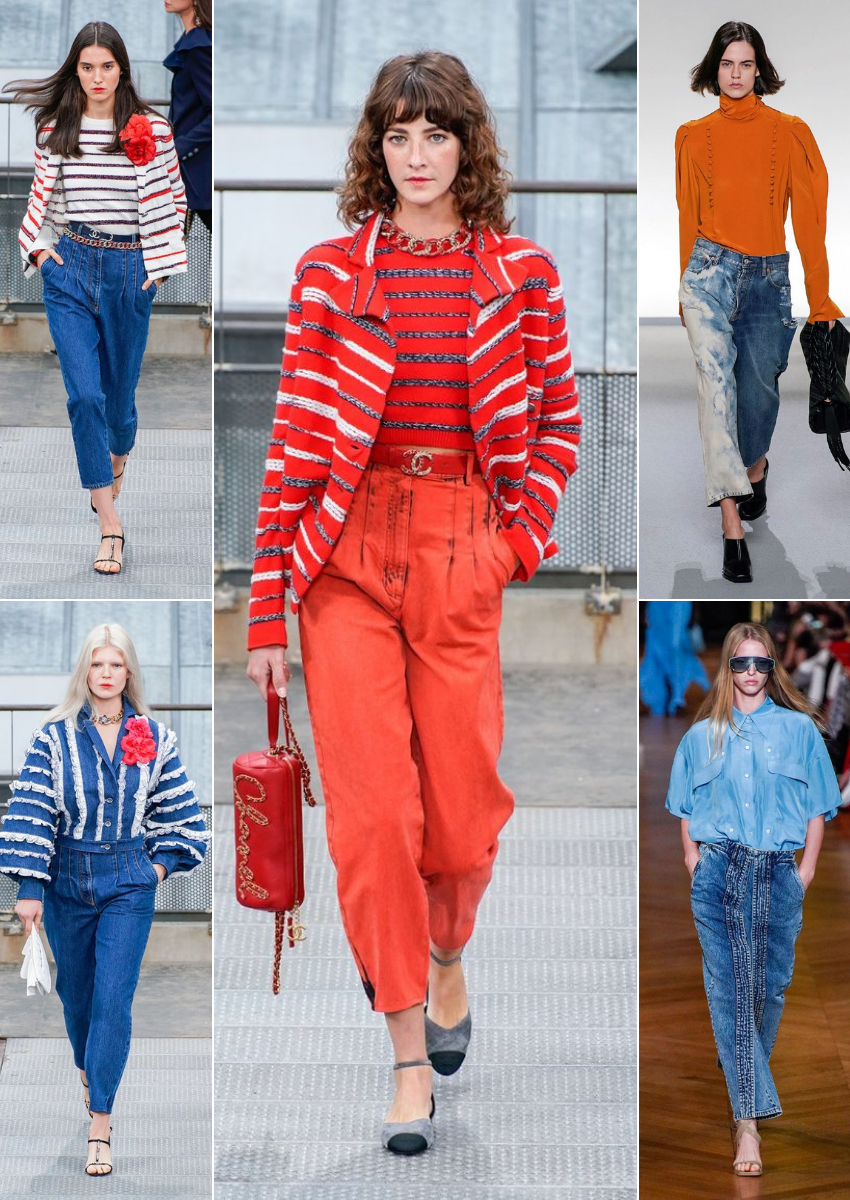 Los jeans acampanados y el total denim, tops skinny, cuellos XXL y estampados vintage.Visto en: Celine, Altuzarra, Victoria Beckham, Marc Jacobs…