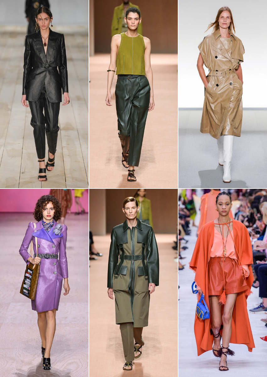 La piel -natural, vegana o sintética- hace su aparición en esta nueva atemporada en prendas con texturas efecto leather y colores. Perfecta en shorts, camisas y vestidos.Visto en: Salvatore Ferragamo, Hermés, Proenza Schouler, Longchamp…